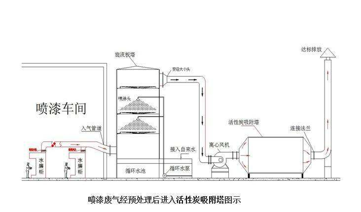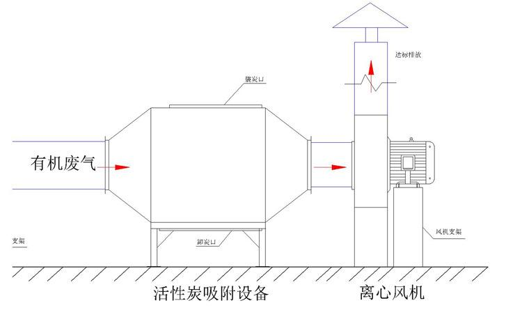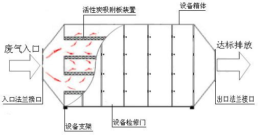 廢氣經(jīng)過(guò)吸附塔內(nèi)的初效過(guò)濾器除去固體顆粒物后,進(jìn)入塔體,經(jīng)過(guò)活性炭層吸附后,除去氣體中的有機(jī)廢氣分子,達(dá)到符合排放標(biāo)準(zhǔn)的凈化氣體,經(jīng)風(fēng)機(jī)排到室外。